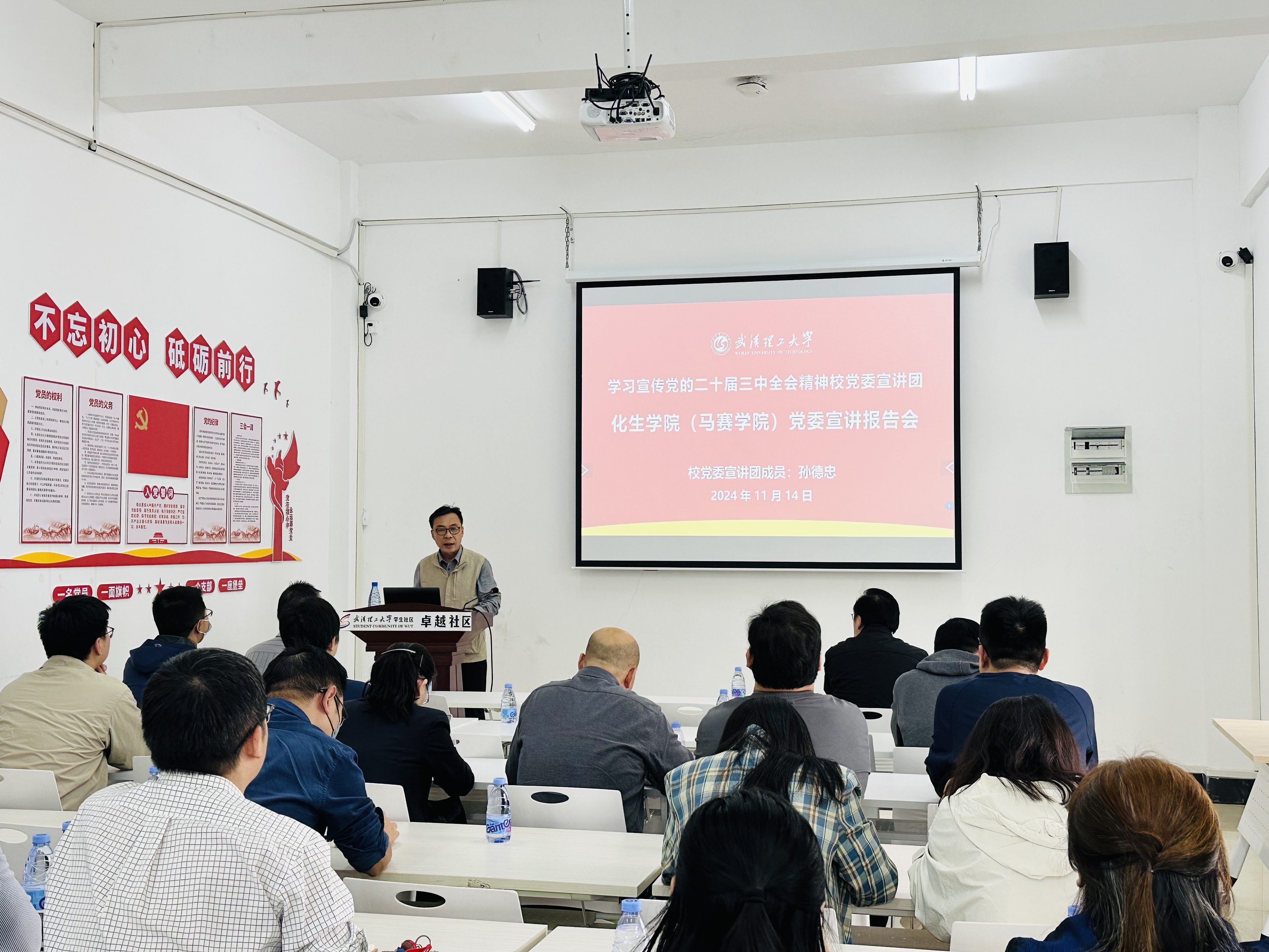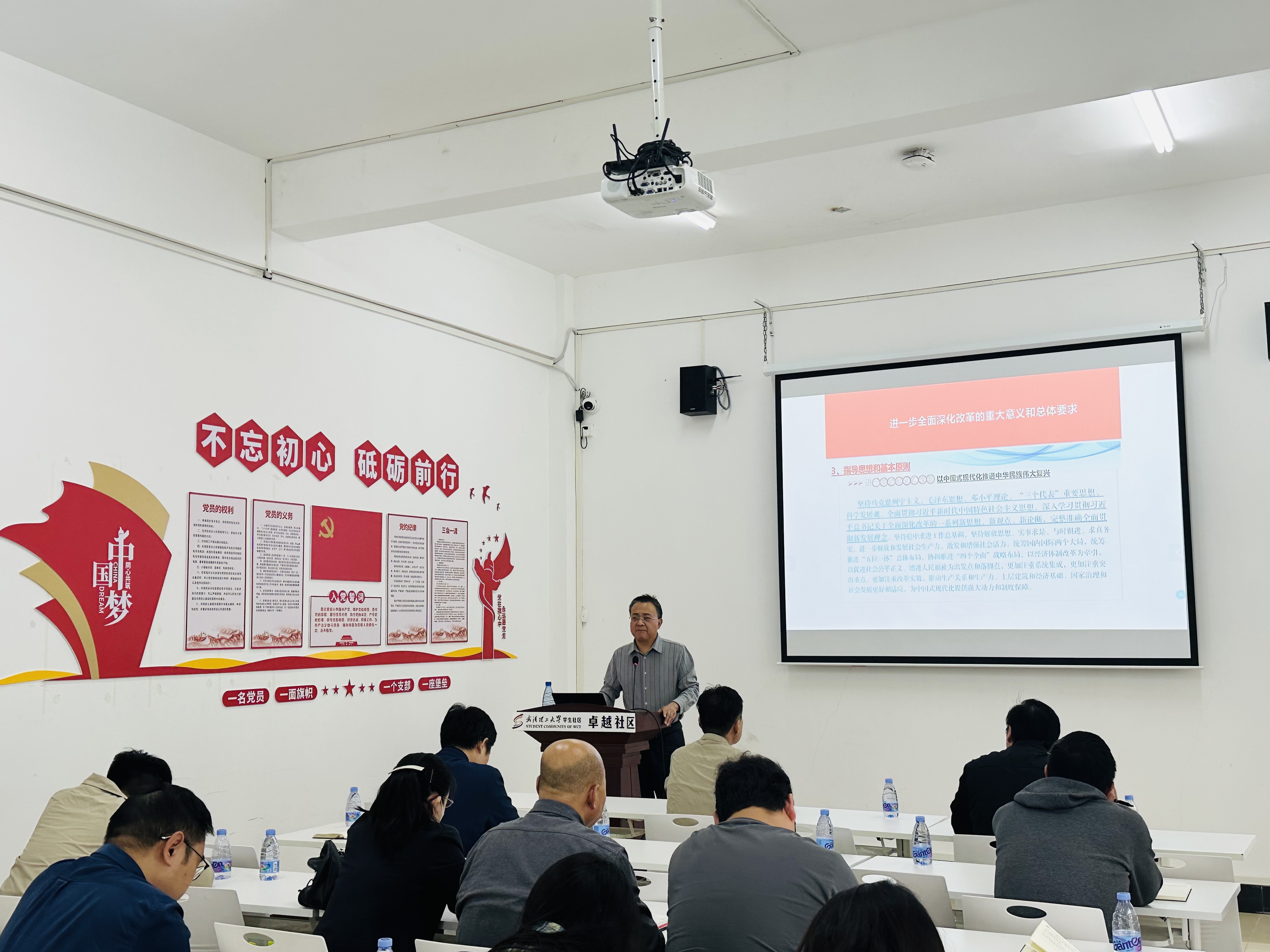 11月14日下午,金沙集团 (马赛学院)党委理论学习中心组在越园6舍党团活动室开展第9次集体学习,邀请校党委宣讲团成员、马克思主义学院孙德忠教授作党的二十届三中全会精神学习专题报告。学院纪委委员、正处级组织员、内设机构负责人及党员师生代表列席学习会。会议由学院党委书记韩同远主持。