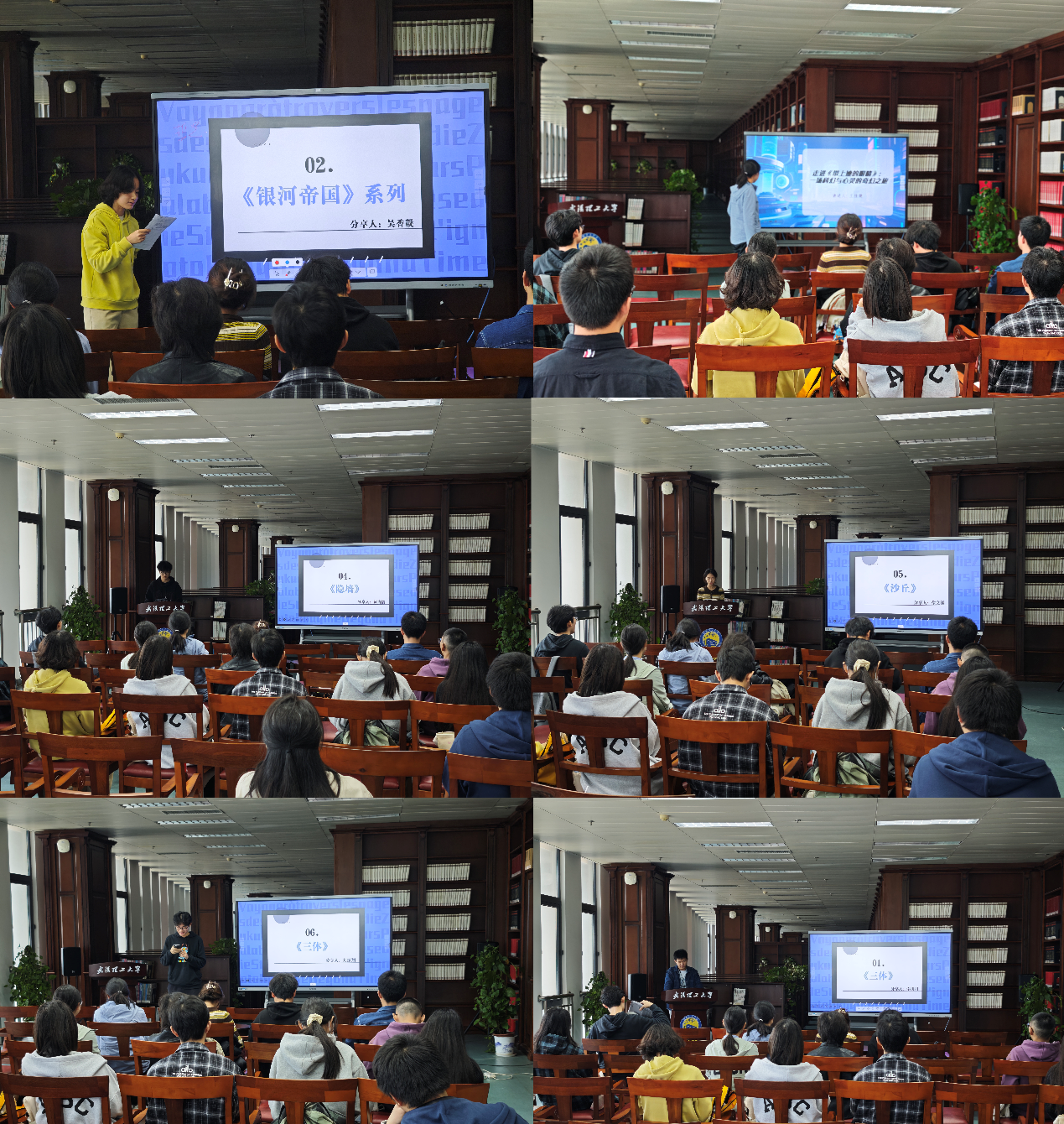 本次分享会精选多部经典科幻作品,涵盖星际探索、人性思辨、未来推演等多元维度,6名分享者以5-10分钟的精炼阐述,分享个性化阅读感悟,构建出“想象与现实交织、科技与人文共生”的阅读图谱。从刘慈欣《三体》中宇宙文明的生存博弈,到阿西莫夫《银河帝国系列》的星际帝国兴衰史诗;从刘慈欣《带上她的眼睛》里穿越时空的感官漫游,到玛格丽特·阿特伍《隐墙》的孤独存在之思,再到弗兰克·赫伯特《沙丘》的沙漠星球权力棋局,每部作品都以独特的科幻设定,为听众打开一扇窥见未来与人性的窗口,助力理工科学生在理性探索中释放想象潜能,实现科学思维与人文感悟的双向赋能。