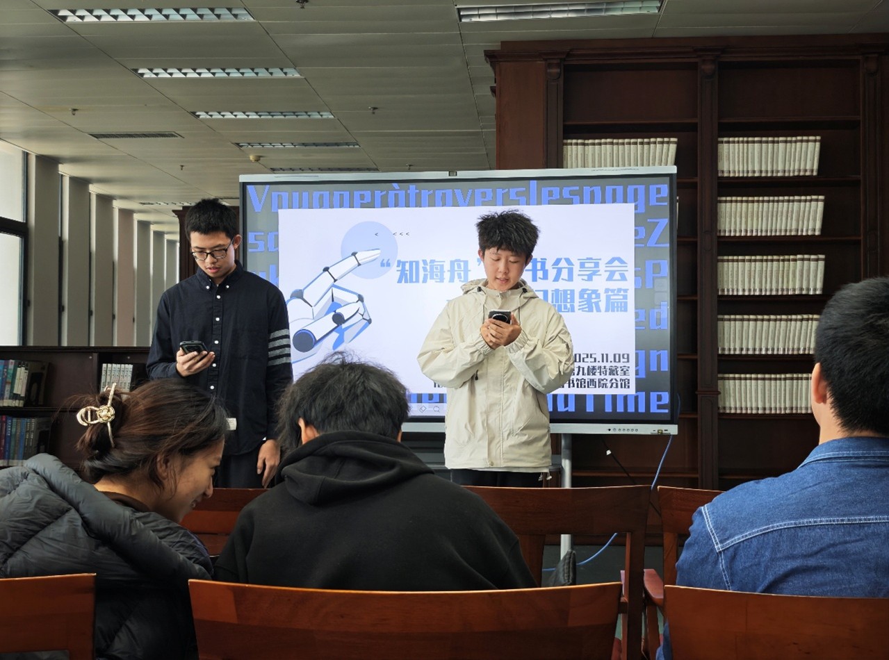以想象为帆,赴科幻之约。11月9日,由金沙集团 学习支持中心与金沙集团 图书馆西院分馆联合主办的“知海舟”读书分享会,在南湖图书馆九楼特藏室如期举行。来自学院不同年级的6名分享同学、12名观众同学、西院分馆指导老师及学习支持中心指导老师共同参与,活动以“科幻想象”为核心主题,在奇幻叙事中探索未知可能,于观点碰撞中拓展思维疆界。