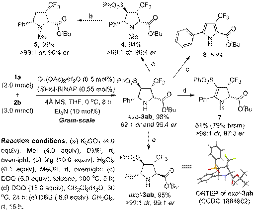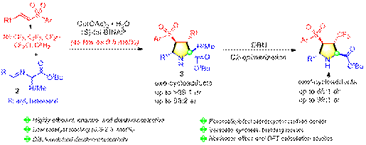 手性多取代四氢吡咯骨架广泛存在于天然产物、药物以及催化剂分子中,因此,发展这类骨架的构建方法引起广泛的关注。甲亚胺叶立德与烯烃的1,3-偶极环加成反应是构建多取代四氢吡咯骨架最直接简便的方法之一,然而,目前报到的方法仍然存在一些局限:催化剂负载量较大(至少5 mol%);较少采用廉价且稳定性好的金属催化剂前体;exo’型选择性产物较少;由相同底物立体发散型合成不同立体构型产物的方法较少。