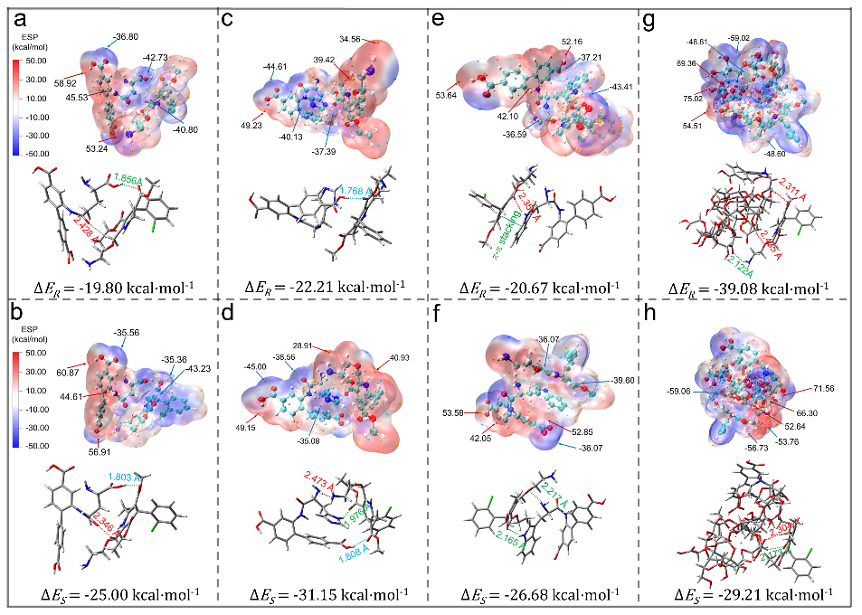 同手性金属有机框架材料(HMOFs)近年来被报道可用于手性分离领域,然而针对具有大分子量和复杂结构的手性药物的有效拆分研究仍极为匮乏,这类药物拆分既具有重要应用价值又更具挑战性。由于多数MOFs材料受限于微孔结构,体积较大的手性药物分子难以进入孔道实现手性识别,这使得分级孔MOFs(HPMOFs)成为新兴研究方向。本研究创新性地采用高强度超声辅助的可控水处理策略调控DUT-5-NH2的动力学水解过程,结合后合成修饰技术在有机框架内接枝手性氨基酸和羧甲基-β-环糊精(CM-β-CD),成功构筑了具有对映选择性的分级孔同手性HPHMOFs材料。所制备的多功能HPHMOFs在保持材料优异结构稳定性与循环性能的前提下,可同时实现吸附选择性拆分、固相萃取拆分乃至色谱柱拆分,对多种药物对映体表现出良好的手性识别能力。这一成果凸显了HPHMOFs材料应对复杂手性分离需求的普适性与高效性。通过分子动力学模拟与量子化学计算的协同分析,揭示了主-客体间氢键作用、范德华力、空间位阻等弱相互作用,以及接枝分子的立体化学结构产生的立体选择效应共同制约着手性识别过程。其中,氢键的空间分布、键合数量及作用强度对所制备材料的对映体分离性能影响最为显著。理论计算进一步阐明,在四类HPHMOFs材料中CM-β-CD接枝的HMOFs展现出最优对映体分离能力的分子机制。特别值得关注的是,HPHMOFs与药物对映体间的吸附能和相互作用能差异与其手性拆分能力具有良好一致性。本研究首次成功实现了HPHMOFs对大分子手性药物(分子量超过300 Da)的对映体选择性拆分,为拓展手性分离材料的应用边界提供了理论支撑与技术范式。