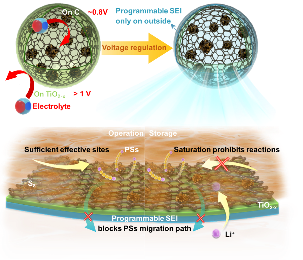 锂硫电池具有极高理论能量密度(2600 Wh·kg⁻¹),但在实用化条件下面临循环性能不足与自放电严重的双重挑战,且二者往往难以兼得。该研究提出一种基于可编程固态电解质界面(SEI)层实现的“禁锢”策略。利用TiO2-x与碳材料不同的成膜电势,通过电压调控实现 SEI 选择性地生长于TiO2-x @C空心结构外壁。工作时,中空球内部结构保持开放以提供高效催化位点,同时外层 SEI 阻隔多硫化物迁移,使其在球腔内达到饱和,借助“饱和禁止效应”显著抑制自放电。该策略首次实现了实用化条件下电化学性能和自放电的平衡优化。成果以“Programmable Solid Electrolyte Interphase Enables Simultaneous Optimization of Electrochemical Performance and Self-Discharge of Lithium Sulfur Batteries under Practical Conditions”为题在《Advanced Energy Materials》上发表,夏佳乐副教授、刘金平教授以及郑州大学郭俊岭教授为论文的共同通讯作者。